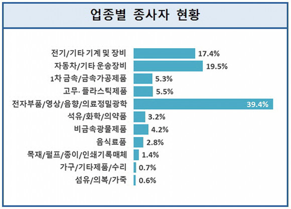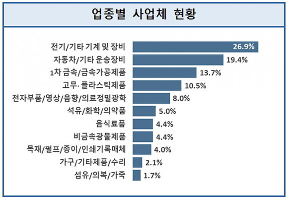 ½Ã Á¦Á¶¾÷ »ç¾÷ü´Â ¡®Àü±â/±âŸ ±â°è ¹× Àåºñ¾÷¡¯ÀÌ 26.9%·Î °¡Àå ³ô°í, Á¾»çÀÚ´Â ¡®ÀüÀÚºÎǰ/¿µ»ó/À½Çâ/ÀÇ·á Á¤¹Ð±¤Çо÷¡¯ÀÌ 39.4%·Î °¡Àå ³ô°Ô Â÷Áö ÇÏ´Â °ÍÀ¸·Î ³ªÅ¸³µ´Ù.