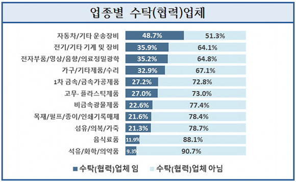¶Ç, ½Ã Á¦Á¶¾÷ »ç¾÷ü Áß ´Ù¸¥ ±â¾÷ ¶Ç´Â »ç¾÷üÀÇ ¡®¼öŹ(Çù·Â)¾÷ü¡¯´Â 32.4%·Î 2022³âµµ 46.8%¿¡¼ 14.4%P °¨¼ÒÇÑ °ÍÀ¸·Î ³ªÅ¸³µÀ¸¸ç, ¾÷Á¾º°·Î´Â ¡®ÀÚµ¿Â÷/±âŸ ¿î¼ÛÀåºñ¾÷¡¯ÀÌ 48.7%·Î °¡Àå ³ô°Ô ³ªÅ¸³µ´Ù.