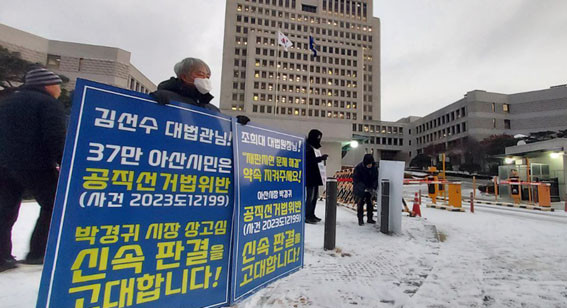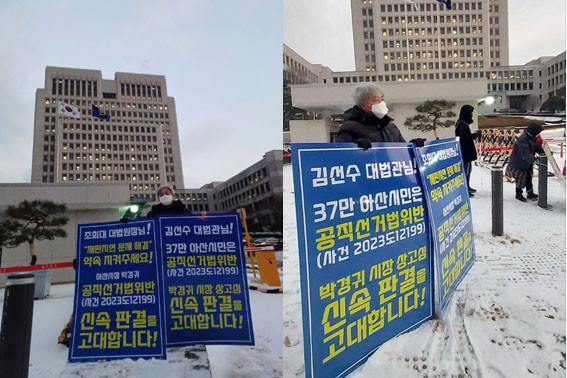 ¾Æ»ê½Ã¹ÎµéÀÇ ½Å¼Ó ÆÇ°á ¿ä±¸´Â À̹ø »Ó¸¸ÀÌ ¾Æ´Ï´Ù. ÀÌ¹Ì Áö³ 11¿ù 17ÀϺÎÅÍ ¹Ú ½ÃÀå¿¡ ´ëÇÑ °øÁ÷¼±°Å¹ýÀ§¹Ý »ç°ÇÀÇ ½Å¼ÓÇÏ°í ¾öÁ¤ÇÑ ÆÇ°áÀ» ¿ä±¸Çϴ ź¿ø¼°¡ ¿ìÆíÀ¸·Î 500Àå ÀÌ»ó Á¢¼öµÆÀ¸¸ç, ¸ð¹ÙÀÏ·Î ÁøÇàµÈ ź¿ø ¼¸í¿¡µµ 1õ¸íÀÌ ³Ñ´Â ½Ã¹ÎµéÀÌ Âü¿©ÇØ ´ë¹ý¿ø¿¡ ¾Æ»ê½Ã¹ÎÀÇ µé²ú´Â ¿©·ÐÀ» Àü´ÞÇÑ ¹Ù ÀÖ´Ù.