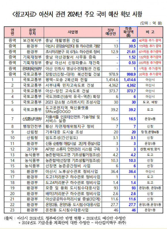 ¶ÇÇÑ Ãæ³²°ú ¾Æ»êÀÇ SOC ¹× ÁÖ¿ä »ç¾÷°ú °ü·ÃÇØ ¡â¾Æ»ê~´çÁø °í¼Óµµ·Î °Ç¼³ 373.7¾ï ¿ø, ¡â¼ºÎ³»·ú ¹ÎÀÚ°í¼Óµµ·Î °Ç¼³ 4õ362¾ï ¿ø, ¡âÀåÇ×¼±(½Åâ~´ë¾ß) º¹¼±Àüö °Ç¼³ 998.9¾ï ¿ø, ¡âÆòÅÃ~¿À¼Û 2º¹¼±È Àüö 1õ414.6¾ï ¿ø µî 2024³âµµ ±¹ºñ ¾à 7õ¿© ¾ï¿ø È®º¸¿¡ ±â¿©Çß´Ù.