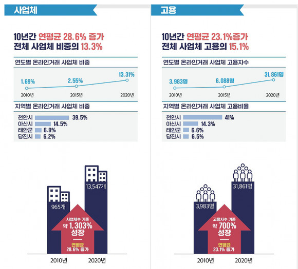 Ãæ³²µµ ¿Â¶óÀΰŷ¡ »ç¾÷ü(2010³â ´ëºñ 2020³â ±âÁØ)´Â 2020³â¿¡ 1¸¸ 3õ547°³·Î 2010³â 965°³º¸´Ù ¾à 13¹è°¡ ´Ã¾ú°í, ¿¬Æò±Õ 28.6%¾¿ Áõ°¡ÇÑ °ÍÀ¸·Î ³ªÅ¸³µ´Ù.