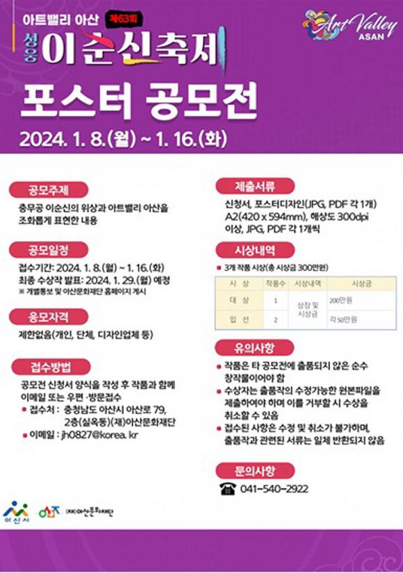 ½Åû¼ µî ÀÚ¼¼ÇÑ »çÇ×Àº ¹®ÈÀç´Ü ȨÆäÀÌÁö(culture.asan.go.kr)¿¡¼ È®ÀÎÇÒ ¼ö ÀÖÀ¸¸ç. ½ÅûÀº ½Åû¼¿Í Æ÷½ºÅ͸¦ À̸ÞÀÏ(jh0827@korea.kr), ¿ìÆí(¾Æ»ê½Ã ¾Æ»ê·Î 79, 2Ãþ ¾Æ»ê¹®ÈÀç´Ü) ¶Ç´Â ¹æ¹® Á¦ÃâÇÏ¸é µÈ´Ù.
