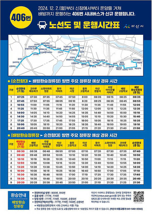 ¹ö½º ¿îÇà°ú °ü·ÃÇÑ ÀÚ¼¼ÇÑ ³»¿ëÀº ¾Æ»ê½Ã ´ëÁß±³Åë°ú(041-540-2582)¿¡ ¹®ÀÇÇϰųª, ¾Æ»ê½Ã¹ö½ºÁ¤º¸½Ã½ºÅÛ(http://bus.asan.go.kr ¶Ç´Â ¸ð¹ÙÀÏ mbus.asan.go.kr)¿¡¼ È®ÀÎÇÒ ¼ö ÀÖ´Ù.