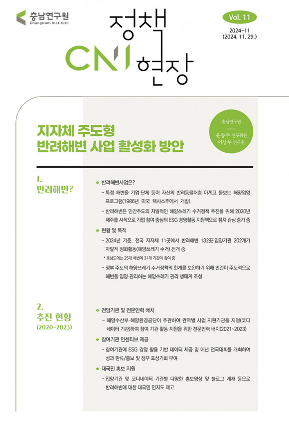 ±×·¯¸é¼ ¡°ÇöÀç Ãæ³²¿¬±¸¿øÀº ¿ÃÇØ¿¡¸¸ ¹Ý·ÁÇØº¯ Âü¿© ±â°ü ÄÚµð³×ÀÌÅÍ ¿ªÇÒÀ» 8ȸ, ÃÑ 400¿© ¸íÀ» ´ë»óÀ¸·Î ÇØ¾ç¾²·¹±â Á¤ÈȰµ¿ ÄÁ¼³ÆÃ ¹× ¾²·¹±â ¹«°Ô ÃøÁ¤°ú ºÐ·ù µî Çǵå¹é ±³À° µîÀ» ½Ç½ÃÇß´Ù¡±¸ç ¡°¹Ý·ÁÇØº¯À» Áö¼ÓÀûÀ¸·Î ÃßÁøÇϱâ À§Çؼ´Â ¡âÁöÀÚü ÁÖµµÇü °ü¸®»ç¾÷ ÁÖüÀÇ ¸íÈ®È ¡â¹Ý·ÁÇØº¯ Âü¿©±â°ü Àμ¾Æ¼ºê °È ¡âÁ¦µµ ¿î¿µÀÇ ³»½ÇÈ µîÀÌ ÇÊ¿äÇÏ´Ù¡±°í Á¦¾ÈÇß´Ù.
