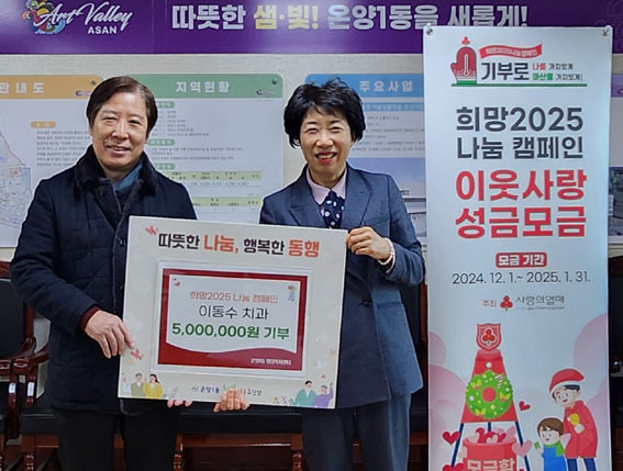 | | ¡è¡è ¡ã¡®Èñ¸Á 2025 ³ª´® Ä·ÆäÀΡ¯ ÀÌ¿ô µ½±â ¼º±Ý Àü´Þ (¿ÞÂʺÎÅÍ À̵¿¼ö ¿øÀå, À¯Á¤¼ø ¿Â¾ç1µ¿Àå) <»çÁøÁ¦°ø=¾Æ»ê½Ã> | ¨Ï (ÁÖ)¿Â¾ç½Å¹®»ç | | À̵¿¼ö Ä¡°ú ÀÇ¿ø(¿øÀå À̵¿¼ö)Àº Áö³ 12¿ù 19ÀÏ ¾Æ»ê½Ã ¿Â¾ç1µ¿ ÇàÁ¤º¹Áö¼¾Å͸¦ ¹æ¹®ÇÏ¿© ¡®Èñ¸Á 2025 ³ª´® Ä·ÆäÀΡ¯¿¡ 500¸¸ ¿øÀ» ±âºÎÇß´Ù.