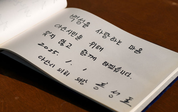 È«¼ºÇ¥ ÀÇÀåÀº ÇöÃæ»ç ¹æ¸í·Ï¿¡ ¡°¹é¼ºÀ» »ç¶ûÇÏ´Â ¸¶À½, ¾Æ»ê½Ã¹ÎÀ» À§ÇØ ÀØÁö ¾Ê°í ÇÔ²² ÇϰڽÀ´Ï´Ù¡±¶ó°í ÀûÀ¸¸ç, ¡°2025³â »õÇØ¿¡´Â ½Ã¹Î°ú ÇÔ²²ÇÏ´Â ÀÇÁ¤È°µ¿À¸·Î ´õ ³ªÀº ¾Æ»êÀ» ¸¸µé±â À§ÇØ ÃÖ¼±À» ´ÙÇϰڴ١±°í ÀüÇß´Ù.