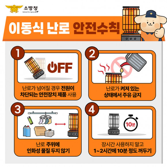 ¾Æ»ê¼Ò¹æ¼´Â À̵¿½Ä ³·Î¸¦ »ç¿ëÇÏ´Â °æ¿ì¿¡ ¹Ýµå½Ã ÁöÄÑ¾ß ÇÒ ¾ÈÀü¼öÄ¢À¸·Î ¡ã³·Î°¡ ³Ñ¾îÁú °æ¿ì Àü¿øÀÌ Â÷´ÜµÇ´Â Á¦Ç°»ç¿ë ¡ã³·Î°¡ ÄÑÁ® ÀÖ´Â »óÅ¿¡¼ ÁÖÀ¯ ±ÝÁö ¡ã³·Î ÁÖÀ§¿¡ ÀÎȼº ¹°Áú µÎÁö ¾Ê±â ¡ãÀå½Ã°£ »ç¿ëÇÏÁö ¸»°í 1~2½Ã°£¿¡ 10ºÐ Á¤µµ ²¨µÎ±â µîÀÌ ÀÖ´Ù°í ÀüÇß´Ù.