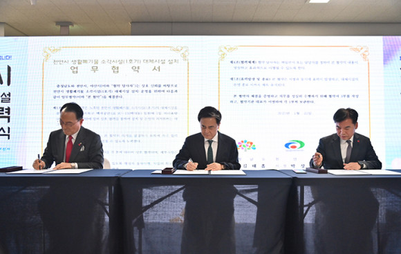 µµ´Â 1¿ù 22ÀÏ Ãµ¾È½Ãȯ°æ¿¡³ÊÁö»ç¾÷¼Ò¿¡¼ ±èÅÂÈì Áö»ç¿Í ¹Ú»óµ· õ¾È½ÃÀå, Á¶Àϱ³ ¾Æ»ê½ÃÀå ±ÇÇÑ´ëÇàÀÌ ¡®Ãµ¾È½Ã ´ëü¼Ò°¢½Ã¼³ »ó»ýÇù·Â¡¯ ¾÷¹«Çù¾àÀ» ü°áÇß´Ù°í ¹àÇû´Ù.