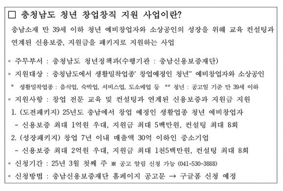 ÃæÃ»³²µµ û³â â¾÷․âÁ÷ Áö¿ø»ç¾÷(»ýȰ¾÷Á¾)Àº ÃæÃ»³²µµ¿¡¼ â¾÷À» ÇϰíÀÚ Çϴ û³â ¿¹ºñâ¾÷ÀÚ¿Í Ã¢¾÷ 7³âÀ̳»ÀÇ Ã»³â±â¾÷ÀÇ ¼º°øÀûÀΠâ¾÷°ú ¼ºÀåÀ» À§ÇÏ¿© ±³À°, ÄÁ¼³ÆÃ, Áö¿ø±Ý(¾÷ü´ç ÃÖ´ë 15¹é¸¸¿ø)°ú ½Å¿ëº¸Áõ(ÃÖ´ë 2¾ï¿ø)À» ÆÐŰÁö·Î Áö¿øÇÏ´Â »ç¾÷ÀÌ´Ù