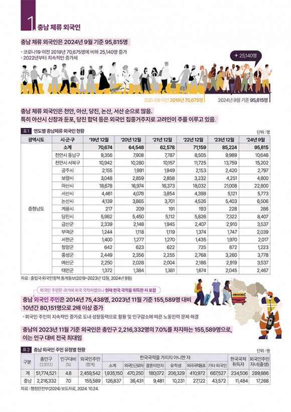 ÀÚ·á¿¡ µû¸£¸é, Ãæ³²µµ ³» ¿Ü±¹ÀÎ ÁÖ¹Î(Çѱ¹±¹Àû Ãëµæ¡¤¹ÌÃëµæÀÚ, ¿Ü±¹ÀÎÁֹΠÀÚ³à µî)Àº 2023³â 11¿ù ±âÁØÀ¸·Î Ãæ³²µµ Àüü Àα¸ÀÇ 7%ÀÎ 155,589¸íÀ¸·Î, Àü±¹ ÃÑÀα¸ ±âÁØ ¿Ü±¹ÀÎ ÁֹΠºñÀ²ÀÎ 4.8%º¸´Ù ÈξÀ ³ôÀº Àü±¹ ÃÖ´ë ±Ô¸ð¸¦ ³ªÅ¸³»°í ÀÖ´Ù.