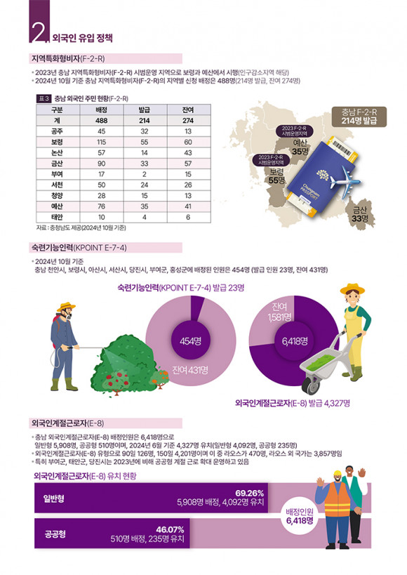 ÇöÀç Ãæ³²µµ´Â ¿Ü±¹ÀÎ À¯ÀÔ Á¤Ã¥À» À§ÇÑ Ã¼·ù À¯Çüº° ´Ù¾çÇÑ ºñÀÚÁ¦µµ¸¦ ¿î¿µÇϰí Àִµ¥, ƯÈ÷ ¿Ü±¹ÀΰèÀý±Ù·ÎÀÚ(E-8) ¹èÁ¤ÀοøÀº 6,418¸íÀ¸·Î, Áö³ÇØ 6¿ù ±âÁØ 4,327¸í(ÀϹÝÇü 4,092¸í, °ø°øÇü 235¸í)À» À¯Ä¡Çß´Ù.