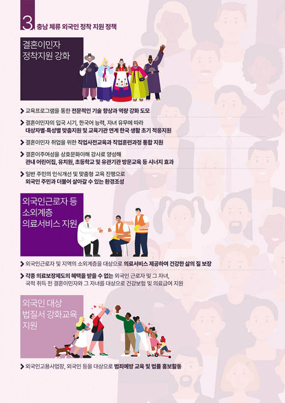 À± Ã¥ÀÓ¿¬±¸¿øÀº ¡°Ãæ³²µµ ü·ù ¿Ü±¹ÀÎÀÇ Á¤Âø Áö¿øÀ» À§ÇÑ ¡â°áÈ¥À̹ÎÀÚ Á¤ÂøÁö¿ø °È ¡â¿Ü±¹ÀαٷÎÀÚ µî ¼Ò¿Ü°èÃþ ÀǷἺñ½º Áö¿ø ¡â¿Ü±¹ÀÎ ´ë»ó ¹ýÁú¼ °È±³À° Áö¿ø µîÀÇ Á¤Ã¥À» ÃßÁøÇØ¾ß ÇÑ´Ù¡±¸ç ¡°Æ¯È÷, Àü¹®ÀûÀÎ ±â¼ú Çâ»óÀ» À§ÇÑ ¸ÂÃãÇü ±³À° ÇÁ·Î±×·¥ ¿î¿µ, ¿Ü±¹ÀÎÀÇ Ã¼·ùÀÚ°Ý ¹× Ư¼ºº°(ÀÚ³à À¯¹«, ¾ð¾î ´É·Â µî) ÀûÀÀÁö¿ø, °áÈ¥ÀÌÁÖ¿©¼ºÀÇ »óÈ£¹®ÈÀÌÇØ °»ç Ȱ¿ë, °Ç°º¸Çè ¹× ÀÇ·áÁö¿ø ½Ã½ºÅÛ ±¸Ãà, ¿Ü±¹ÀÎ ´ë»ó ¹üÁË¿¹¹æ ±³À° µî¿¡ ÁýÁßÇÒ Çʿ䰡 ÀÖ´Ù¡±°í Á¦¾ÈÇß´Ù.