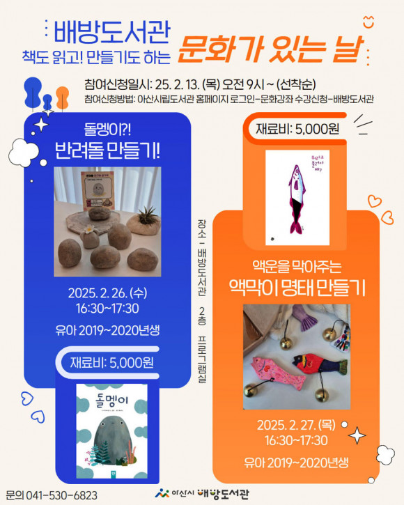 À̹ø 2¿ù ¹®È°¡ ÀÖ´Â ³¯ ÇÁ·Î±×·¥Àº ÇÔ²² ±×¸²Ã¥À» ÀÐ°í ±×¿¡ °ü·ÃµÈ ¸¸µé±â Ȱµ¿À» ÇÒ ¼ö ÀÖ´Â µ¶ ÈÄ ¿¬°è ÇÁ·Î±×·¥À¸·Î 26ÀÏÀº ¡®µ¹¸æÀÌ?! ¹Ý·Áµ¹ ¸¸µé±â¡¯, 27ÀÏÀº ¡®¾×¿îÀ» ¸·¾ÆÁÖ´Â ¾×¸·ÀÌ ¸íÅ ¸¸µé±â¡¯°¡ ÁøÇàµÈ´Ù.