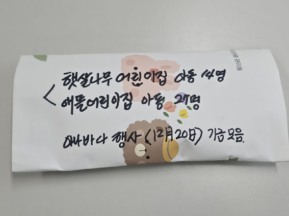 | | ¡è¡è ¡ãÀü´Þ¹ÞÀº ÈÄ¿ø±Ý <»çÁøÁ¦°ø=¾Æ»ê½Ã> | ¨Ï (ÁÖ)¿Â¾ç½Å¹®»ç | | À̵ο ÅÁÁ¤¸éÀåÀº ¡°¾Æ³ª¹Ù´Ù Çà»ç ¼öÀͱÝÀ» ±âºÎÇØÁֽоÖÇá¤Ç޻쳪¹« ¾î¸°ÀÌÁý ¾ÆÀ̵é°ú ¼±»ý´Ôµé°Ô °¨»çµå¸°´Ù¡±¸ç ¡°¾ÆÀ̵éÀÇ ¼ÒÁßÇÏ°í µû¶æÇÑ ¸¶À½ÀÌ Àß Àü´ÞµÉ ¼ö ÀÖµµ·Ï ³ë·ÂÇϰڴ١±°í ¸»Çß´Ù.
