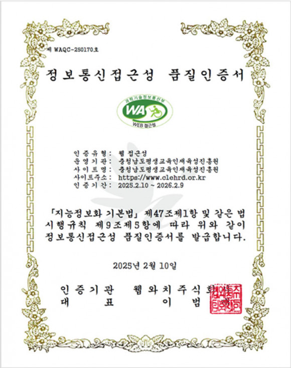 Ãæ³²Æò»ý±³À°ÀÎÀçÀ°¼ºÁøÈï¿øÀº ±¹°¡ÀÎÁõ ±â°ü(WebWatch)À¸·Î ºÎÅÍ È¨ÆäÀÌÁö(www.clehrd.or.kr) À¥Á¢±Ù¼º ǰÁúÀÎÁõ ¸¶Å©¸¦ ȹµæÇß´Ù°í ¹àÇû´Ù.