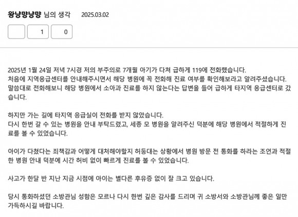 ¶Ç °°Àº ´Þ 24ÀÏ ¿ÀÈÄ 7½Ã 10ºÐ°æ¿¡´Â ħ´ë¿¡¼ 7°³¿ù ¾Æ±â°¡ ¶³¾îÁ® ÀÀ±Þ½ÇÀ» ¼ö¼Ò¹®ÇÏ´Â ½Å°í ÀüÈ¿¡ ´ëÀÀÇØ µµ³»¸¦ ¹þ¾î³ ¼¼Á¾ Áö¿ª±îÁö ¼Ò¾Æ°ú ¿Ü»ó Áø·á°¡ °¡´ÉÇÑ ÀÀ±Þ½Ç°ú ´çÁ÷ º´¿øÀ» ã¾Æ º´¿ø Á¤º¸¸¦ ¹®ÀÚ¸Þ½ÃÁö·Î Àü¼ÛÇÏ°í ¹ß°ÉÀ½ÀÌ ÇêµÇÁö ¾Êµµ·Ï ³»¿ø Àü Âü°í »çÇ× µîÀ» ¾È³»Çß´Ù.