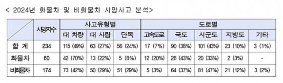 °æÂû¿¡ µû¸£¸é, ÀÚµ¿Â÷ Áß È¹°Â÷ µî·Ï´ë¼ö´Â ¾à 23.6¸¸´ë·Î ÀüüÀÇ 19%(¡¯24. 12¸»±âÁØ)ÀÌÁö¸¸, ȹ°Â÷ ¿îÀüÀÚÀÇ °ú½Ç·Î »ç¸ÁÇÑ »ç¶÷Àº 60¸íÀ¸·Î Àü³â 45¸í ´ëºñ 15¸í(33%)ÀÌ Áõ°¡Çß°í, Àüü »ç¸ÁÀÚ(234¸í)ÀÇ 26%¸¦ Â÷ÁöÇÑ´Ù.