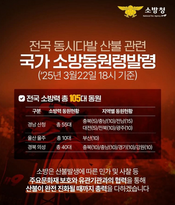 21ÀÏ ¿ÀÈÄ °æ»ó±ÇÀ» Áß½ÉÀ¸·Î ¹ß»ýÇÑ »êºÒÀ» ½ÃÀÛÀ¸·Î Àü±¹ °¢Áö¿¡¼ µ¿½Ã´Ù¹ßÀûÀ¸·Î »êºÒÀÌ ¹ß»ýÇϰí È®»êµÊ¿¡ µû¶ó ¼Ò¹æÃ»Àº ±¹°¡ ¼Ò¹æµ¿¿ø·ÉÀ» ¹ß·ÉÇÏ¿´°í ÇöÀç ¾Æ»ê¼Ò¹æ¼¿¡¼´Â 2´ëÀÇ ¼Ò¹æÂ÷·® ¹× 14¸íÀÇ ¼Ò¹æ°ø¹«¿øÀÌ ÅõÀԵǾî Áö¿ø Ȱµ¿¿¡ ÀÓÇϰí ÀÖ´Ù.