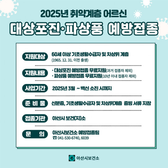 | | ¡è¡è ¡ã¿¹¹æÁ¢Á¾ ¾È³»¹®(´ë»óÆ÷Áø, ÆÄ»ódz) | ¨Ï (ÁÖ)¿Â¾ç½Å¹®»ç | | ¾Æ»ê½Ã°¡ 3¿ù 26ÀϺÎÅÍ 60¼¼ ÀÌ»ó Ãë¾à°èÃþÀ» ´ë»óÀ¸·Î ´ë»óÆ÷Áø°ú ÆÄ»ódz ¹«·á ¿¹¹æÁ¢Á¾À» ½ÃÀÛÇÑ´Ù.