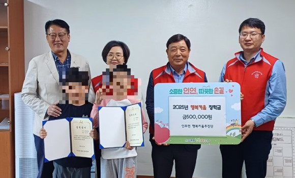 ÀÎÁÖ¸é ÇູŰ¿òÃßÁø´ÜÀº ÈÄ¿ø±ÝÀ¸·Î ¸¶·ÃÇÑ ÀåÇбÝÀ» ÇØ´ç Çб³¿¡ ¹æ¹®ÇÏ¿© ÀåÇÐ Áõ¼¸¦ Àü´ÞÇϰí, Çлýµé¿¡°Ô µû¶æÇÑ ÀÀ¿øÀÇ ¸Þ½ÃÁö¸¦ ÀüÇß´Ù.
