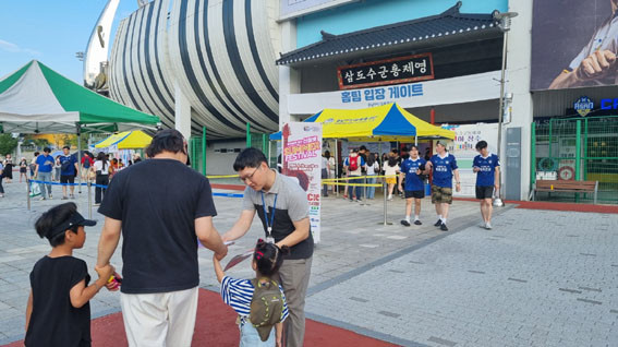 À̳¯ ¾Æ»ê½Ã ¹®È¿¹¼ú°ú Á÷¿øµéÀº Ãæ³²¾Æ»êFC¿Í ¾È»ê±×¸®³Ê½ºFCÀÇ °æ±â¸¦ ÀÀ¿øÇϱâ À§ÇØ À̼ø½ÅÁ¾ÇտÀåÀ» ãÀº °üÁßµéÀ» ´ë»óÀ¸·Î ÃàÁ¦ È«º¸¹°À» ³ª´²ÁÖ¸ç ¡®½æ¸Ó Æä½ºÆ¼¹ú¡¯ È«º¸¿¡ ¿À» ¿Ã·È´Ù.