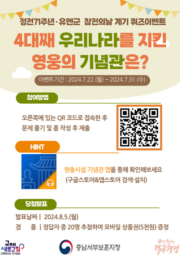 À̹ø ÄûÁîÀ̺¥Æ®¿¡¼´Â 6?25ÀüÀï°ú °ü·ÃÀÌ ±íÀº °ü³» ÇöÃæ½Ã¼³À» ¼Ò°³Çϰí ÀÖÀ¸¸ç ¡®ÇöÃæ½Ã¼³ ±â³ä°ü ¾È³»¡¯ ¾ÛÀ» ÅëÇØ Á¤´ä¿¡ ´ëÇÑ Á¤º¸¸¦ ¾òÀ» ¼ö ÀÖ´Ù.