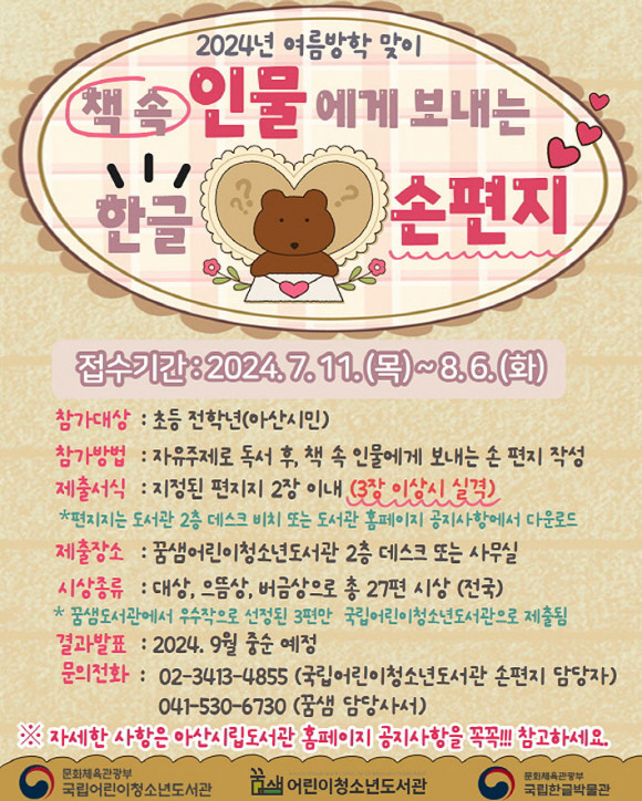 | | ¡è¡è ¡ã²Þ»ù¾î¸°ÀÌû¼Ò³âµµ¼°ü ÇÑ±Û ¼Õ ÆíÁö °ø¸ðÀü ÀÚü Æ÷½ºÅÍ | ¨Ï (ÁÖ)¿Â¾ç½Å¹®»ç | | ¾Æ»ê½Ã ²Þ»ù¾î¸°ÀÌû¼Ò³âµµ¼°ü(ÀÌÇÏ ²Þ»ùµµ¼°ü)ÀÌ ¡®±¹¸³¾î¸°ÀÌû¼Ò³âµµ¼°ü¡¯¿¡¼ ÁøÇàÇÏ´Â <Á¦10ȸ Ã¥ ¼Ó Àι°¿¡°Ô º¸³»´Â ÇÑ±Û ¼ÕÆíÁö °ø¸ðÀü>¿¡ ¼±Á¤µÅ Âü°¡ÀÛÀ» ¸ðÁýÇÑ´Ù.