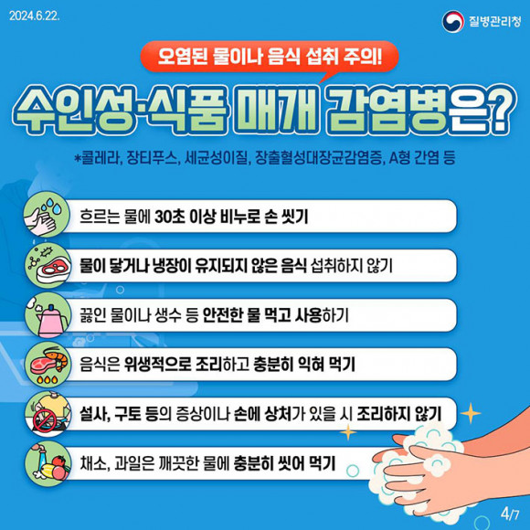 ƯÈ÷ 7¿ùÀº À帶°¡ ½ÃÀÛµÇ°í ½ÀÇÑ ³¯¾¾ Å¿¿¡ º´¿ø¼º ¹Ì»ý¹° Áõ½ÄÀÌ È°¹ßÇØÁ® ¿À¿°µÈ ¹°°ú À½½Ä ¼·Ãë·Î ÀÎÇÑ ¼öÀμº¡¤½Äǰ ¸Å°³ °¨¿°º´¿¡ °¢º°ÇÑ ÁÖÀǰ¡ ÇÊ¿äÇÏ´Ù.