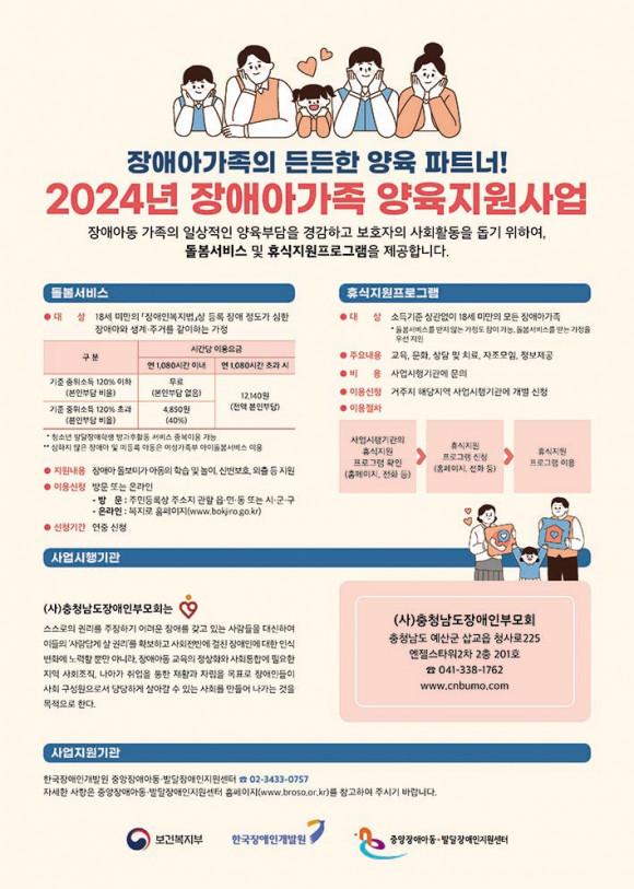 Ãæ³²µµ´Â µµ³» Àå¾Ö¾Æ °¡Á¤ÀÇ ÀÏ»óÀûÀÎ ¾çÀ° ºÎ´ãÀ» °æ°¨ÇÏ°í º¸È£ÀÚÀÇ »çȸȰµ¿À» µ½±â À§ÇØ Àå¾Ö¾Æ °¡Á·¿¡°Ô µ¹º½¼ºñ½º¿Í ÈÞ½Ä Áö¿ø ÇÁ·Î±×·¥À» Á¦°øÇÏ´Â ¡®Àå¾Ö¾Æ °¡Á· ¾çÀ° Áö¿ø»ç¾÷¡¯À» ÃßÁø ÁßÀÌ´Ù.