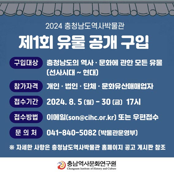 Ãæ³² °ü·Ã À¯¹°À» ¼ÒÀåÇϰí ÀÖ´Â °³Àΰú ´Üü, ¹ýÀÎ, ¹®ÈÀ¯»ê¸Å¸Å¾÷ÀÚ µîÀÌ Âü¿©ÇÒ ¼ö ÀÖÀ¸¸ç, ¿¬±¸¿ø ȨÆäÀÌÁö(cihc.or.kr) ¶Ç´Â ¹Ú¹°°ü ȨÆäÀÌÁö(museum.cihc.or.kr)¿¡¼ Á¦Ãâ¼·ù¸¦ ³»·Á¹Þ¾Æ À̸ÞÀÏ(son@cihc.or.kr) ¶Ç´Â ¿ìÆíÀ¸·Î Á¢¼öÇÏ¸é µÈ´Ù.