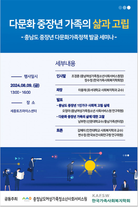 Ãæ³²¿©¼º°¡Á·Ã»¼Ò³â»çȸ¼ºñ½º¿ø(Á¶°æÈÆ ¿øÀå: ÀÌÇÏ Ãæ³²»çȸ¼ºñ½º¿ø)Àº Áö³ 8¿ù 9ÀÏ Çѱ¹°¡Á·»çȸº¹ÁöÇÐȸ(Àå¼öÁ¤ ȸÀå)¿Í ¡®ÁßÀå³â ´Ù¹®È°¡Á·ÀÇ ½ÇÅÂ¿Í Áö¿ø¹æ¾È¡¯À» ÁÖÁ¦·Î °øµ¿¼¼¹Ì³ª¸¦ ÁøÇàÇß´Ù.