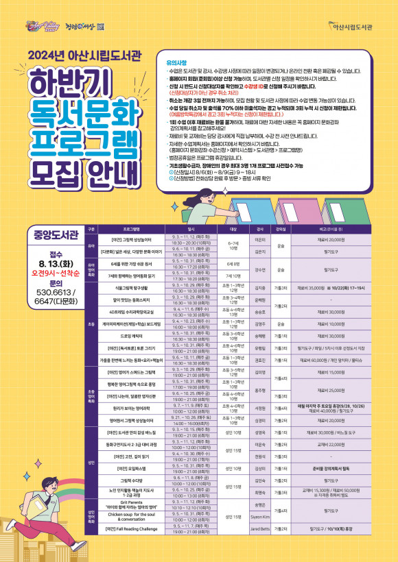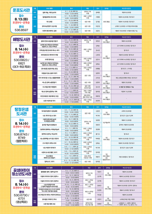 ¼ö° ½ÅûÀº ¾Æ»ê½Ã¸³µµ¼°ü ȨÆäÀÌÁö¿¡¼ ¼±Âø¼øÀ¸·Î ÁøÇàµÈ´Ù. Áß¾Ó¡¤µÐÆ÷µµ¼°üÀº ¿À´Â 8¿ù 13ÀÏ, ¹è¹æ¡¤ÅÁÁ¤¿Â»ù¡¤²Þ»ù¾î¸°ÀÌû¼Ò³âµµ¼°üÀº 14ÀÏ ¿ÀÀü 9½ÃºÎÅÍ ½ÅûÇÒ ¼ö ÀÖ´Ù. ±âŸ ÀÚ¼¼ÇÑ »çÇ×Àº ¾Æ»ê½Ã¸³µµ¼°ü ȨÆäÀÌÁö °øÁö»çÇ×À» Âü°íÇϰųª °¢ µµ¼°ü(Á߾ӿÆÀ ¢Ï041-530-6613)À¸·Î ¹®ÀÇÇÏ¸é µÈ´Ù.