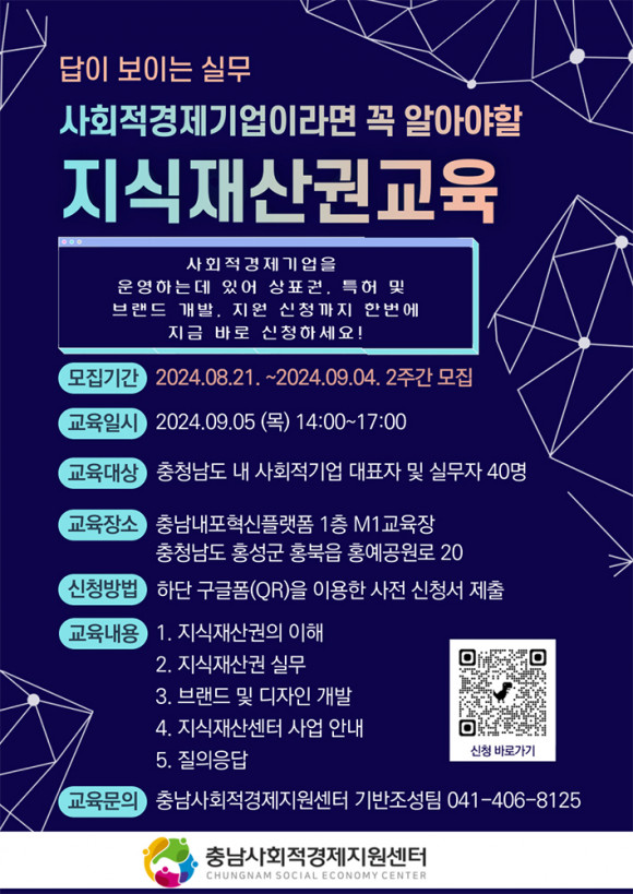 Ãæ³²»çȸÀû°æÁ¦Áö¿ø¼¾ÅÍ(¼¾ÅÍÀå ÀÌ»ó¿µ)(ÀÌÇÏ ¡®¼¾ÅÍ¡¯)´Â »çȸÀû°æÁ¦±â¾÷ÀÇ Æ¯Çã±Ç, »óÇ¥±Ç°ú °°Àº Áö½ÄÀç»ê±Ç Ä§ÇØ ¹× º¸È£¸¦ À§ÇØ 9¿ù 5ÀÏ Ãæ³²°ø°¨¸¶·ç(±¸ ³»Æ÷Çõ½ÅÇ÷§Æû) 1Ãþ M1±³À°Àå¿¡¼ ¡®´ä½Ç¹« Áö½ÄÀç»ê±Ç ±³À°¡¯À» ÁøÇàÇÒ ¿¹Á¤ÀÌ´Ù.