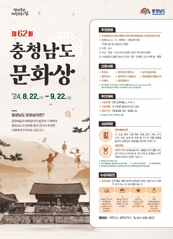 Ãæ³²µµ´Â ´ÙÀ½´Þ 22ÀϱîÁö ¡®Á¦62ȸ ÃæÃ»³²µµ ¹®È»ó¡¯ Èĺ¸ÀÚ¸¦ °ø°³ Ãßõ¹Þ´Â´Ù°í 8¿ù 20ÀÏ ¹àÇû´Ù.