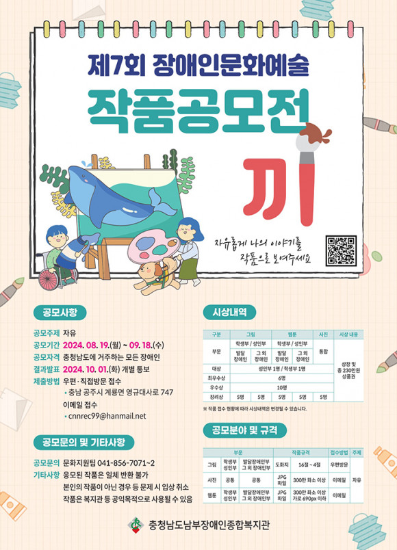 ÃæÃ»³²µµ³²ºÎÀå¾ÖÀÎÁ¾ÇÕº¹Áö°ü(°üÀå ±èÅ¿ì)Àº Á¦7ȸ Àå¾ÖÀÎ ¹®È¿¹¼ú ÀÛǰ°ø¸ðÀü ¡°³¢¡±ÀÇ ÀÛǰÁ¢¼ö¸¦ 08¿ù 19ÀϺÎÅÍ 09¿ù 18ÀϱîÁö ÇÑ´Ù.
