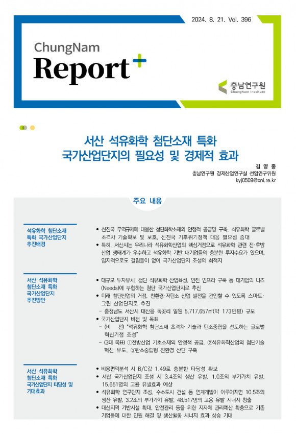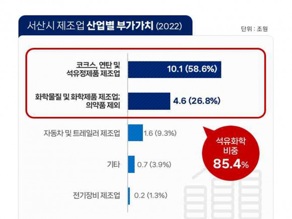 ÃÖ±Ù Ãæ³²¿¬±¸¿ø ±è¾çÁß ¼±ÀÓ¿¬±¸À§¿øÀº ¡°¼»ê ¼®À¯ÈÇР÷´Ü¼ÒÀç Æ¯È ±¹°¡»ê¾÷´ÜÁöÀÇ Çʿ伺 ¹× °æÁ¦Àû È¿°ú¡± º¸°í¼(Ãæ³²¸®Æ÷Æ®Ç÷¯½º 396È£)¿¡¼ ¡°¼»ê½ÃÀÇ ÄÚÅ©½º, ¿¬Åº ¹× ¼®À¯Á¤Á¦Ç° Á¦Á¶¾÷ & ÈÇй°Áú ¹× ÈÇÐÁ¦Ç° Á¦Á¶¾÷ÀÇ ºÎ°¡°¡Ä¡´Â °¢°¢ 10.1Á¶ ¿ø, 4.6Á¶ ¿øÀ¸·Î, ¼»ê½Ã´Â ¿ì¸®³ª¶ó ¼®À¯ÈÇлê¾÷À» °ßÀÎÇÏ´Â ÇÙ½ÉÁö¿ª¡±À̶ó°í ¸»Çß´Ù.