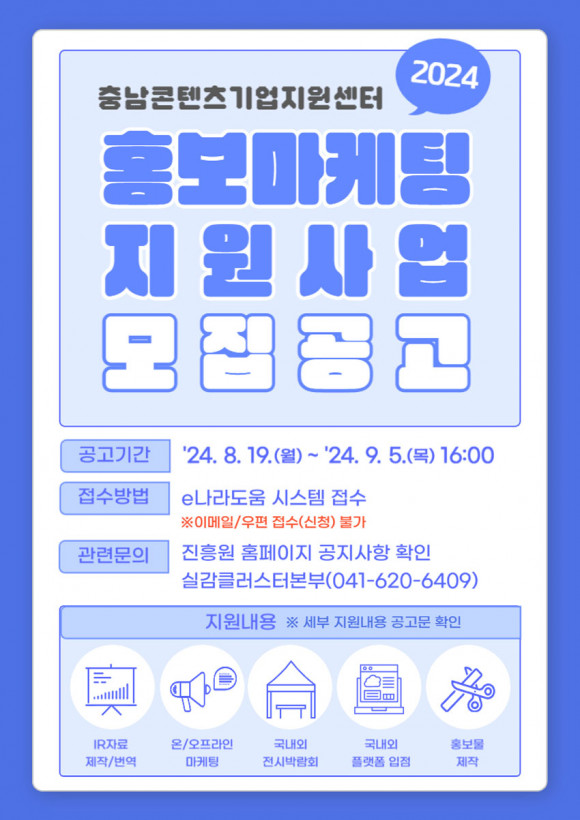 Ãæ³²ÄÜÅÙÃ÷±â¾÷Áö¿ø¼¾ÅÍ ¡®2024 È«º¸¸¶ÄÉÆÃ Áö¿ø»ç¾÷¡¯ Áö¿ø´ë»óÀº Ãæ³²µµ ³» 6°³¿ù ÀÌ»ó º»»ç¸¦ µÎ°í ÀÖ´Â °³ÀÎ ¹× ¹ýÀλç¾÷ÀÚÀ̸ç, ÄÜÅÙÃ÷ ¶Ç´Â ÀÚü IP¸¦ º¸À¯Çϰí ÀÖ¾î¾ß ÇÑ´Ù. ½Åû±â°£Àº ¿À´Â 9¿ù 5ÀÏ(¸ñ)±îÁö·Î, ÀÚ¼¼ÇÑ ³»¿ëÀº ÁøÈï¿ø ´©¸®Áý(https://www.ctia.kr/home/main.do)°ú e-³ª¶óµµ¿ò(https://www.gosims.go.kr/)¿¡¼ È®ÀÎÇÒ ¼ö ÀÖ´Ù.