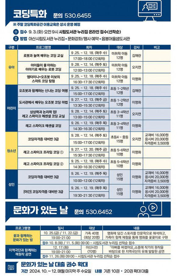 ¼¼ºÎ ÇÁ·Î±×·¥Àº ¡ã(ÁÖ/¾ß°£)ÄÚµù ÀÚ°ÝÁõ ´ëºñ¹Ý ¡ã·¹°í ½ºÆÄÀÌÅ© ¿¡¼¾¼È¡¤ÇÁ¶óÀÓ ÄÚµù ¡ã¿ÀÁ¶º¿°ú ÇÔ²²ÇÏ´Â ½Å³ª´Â ÄÚµù ¿©Çà ¡ã·Îº¿°ú ³î¸ç ¹è¿ì´Â ÄÚµù ±³½Ç µî 12°³ÀÇ ÄÚµù ƯÈÇÁ·Î±×·¥°ú ´õºÒ¾î ÁÖ¸»¿¡´Â ÄÚµù ³îÀÌÇнÀÀ» À§ÇÑ ¡®¸ÖƼÅÍÄ¡ ½º¸¶Æ® Å×ÀÌºí¡¯ ÀÌ¿ë ±³À°ÀÌ ¸ÅÁÖ ¿î¿µµÉ ¿¹Á¤ÀÌ´Ù.