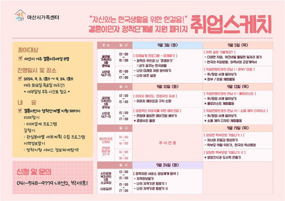 ¾Æ»ê½Ã°¡Á·¼¾ÅÍ´Â °áÈ¥À̹ÎÀÚ Á¤Âø´Ü°èº° Áö¿øÆÐŰÁö ¡®Ãë¾÷½ºÄÉÄ¡¡¯¸¦ Áö³ 3ÀÏ °³°Çß´Ù.