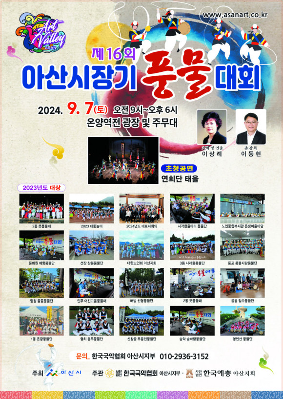 ¾Æ»ê½Ã(½ÃÀå ¹Ú°æ±Í)°¡ ÁÖÃÖÇÏ°í »ç´Ü¹ýÀÎ Çѱ¹±¹¾ÇÇùȸ ¾Æ»ê½ÃÁöºÎ(ÁöºÎÀå ÀÌ»ó·Ê)°¡ ÁÖ°üÇϸç, »ç´Ü¹ýÀÎ Çѱ¹¿¹ÃÑ ¾Æ»êÁöȸ(ÁöȸÀå À̵¿Çö)°¡ ÈÄ¿øÇÏ´Â Á¦16ȸ ¾Æ»ê½ÃÀå±â dz¹°´ëȸ°¡ ¿À´Â 9¿ù 7ÀÏ ¿Â¾ç¿Âõ¿ª ¾Õ ±¤Àå ¹× ÁÖ¹«´ë¿¡¼ °³ÃֵȴÙ.