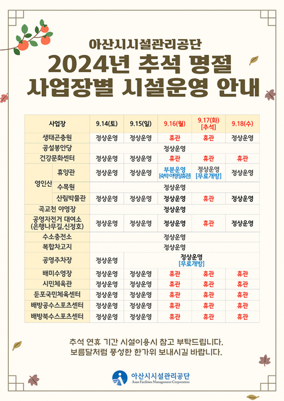 ¾Æ»ê½Ã½Ã¼³°ü¸®°ø´Ü(ÀÌ»çÀå ±èÈ¿¼·, ÀÌÇÏ °ø´Ü)Àº Ãß¼® ¸íÀý ¿¬ÈÞ ±â°£ ½Ã¹ÎµéÀÇ ¾ÈÀüÇÑ ½Ã¼³ ÀÌ¿ëÀ» À§ÇØ ¡®Ãß¼® ¸íÀý ¿î¿µ°èȹ¡¯À» ¼ö¸³Çß´Ù°í 5ÀÏ ¹àÇû´Ù.