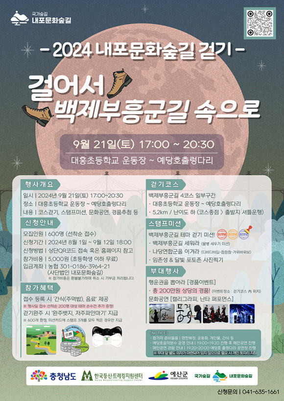 Âü°¡ ½ÅûÀº 12ÀϱîÁö ³»Æ÷¹®È½£±æ ´©¸®Áý(www.naepotrail.org)À» ÅëÇØ ÇÒ ¼ö ÀÖÀ¸¸ç, ÀÚ¼¼ÇÑ ½Åû ¹®ÀÇ´Â ÀüÈ(041-635-1661/041- 338-0773)·Îµµ °¡´ÉÇÏ´Ù.