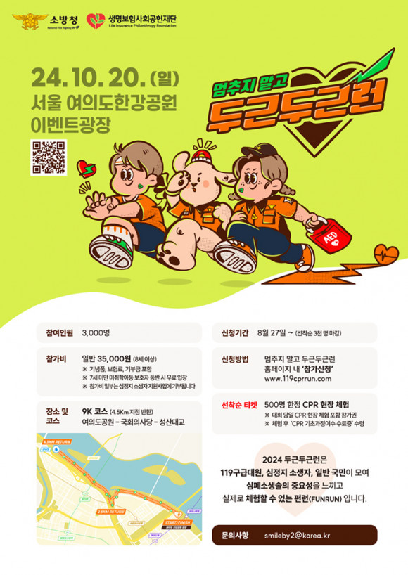 ¸¶¶óÅæ ÄÚ½º´Â ÃÑ 9km·Î 1km¸¶´Ù ½ÉÆó¼Ò»ý¼ú ´Ü°è¸¦ ÇнÀÇÒ ¼ö ÀÖ´Â ÆÝ·±(FUN RUN)ÀÇ Çü½ÄÀ¸·Î ÁøÇàµÇ¸ç ÀÚ¼¼ÇÑ ÀÏÁ¤Àº QRÄÚµå ¹× µÎ±ÙµÎ±Ù·± °ø½Ä ȨÆäÀÌÁö(https://www.119cprrun.com/)¿¡¼ È®ÀÎ °¡´ÉÇÏ´Ù.