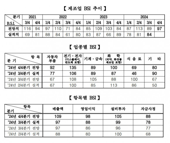 Á¶»ç °á°ú¸¦ º¸¸é ¢º2024³â 4/4ºÐ±â ±â¾÷°æ±âÀü¸ÁÁö¼ö´Â ÀüºÐ±â ¡®89¡¯ ´ëºñ 8Æ÷ÀÎÆ® »ó½ÂÇÑ ¡®97¡¯À¸·Î ³ªÅ¸³µ°í, ¢º2024³â 3/4ºÐ±â ½ÇÀûÁö¼ö´Â ÀüºÐ±â ¡®81¡¯ ´ëºñ 3Æ÷ÀÎÆ® »ó½ÂÇÑ ¡®84¡¯·Î ³ªÅ¸³µ´Ù.