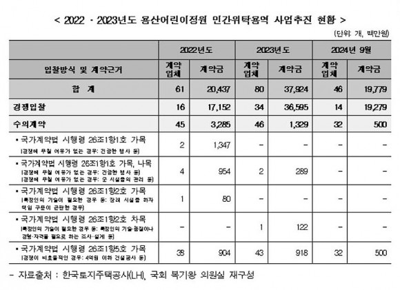 Áö³ 10¿ù 6ÀÏ ±¹È¸ ±¹Åä±³ÅëÀ§¿øÈ¸ ¼Ò¼Ó º¹±â¿Õ ±¹È¸ÀÇ¿ø(´õºÒ¾î¹ÎÁÖ´ç, Ãæ³² ¾Æ»ê½Ã°©)ÀÌ LH¸¦ ÅëÇØ È®º¸ÇÑ ÀڷḦ ºÐ¼®ÇÑ °á°ú, 2022³âºÎÅÍ 2024³â ¿ÃÇØ±îÁö ¿ë»ê¾î¸°ÀÌÁ¤¿ø Á¶¼º °ü·Ã °ø»ç³ª °³¹æ Çà»ç µîÀ» ÃßÁøÇϱâ À§ÇØ Ã¼°áµÈ ¿ë¿ª°è¾à ÃÑ 187°³ Áß 123°³°¡ ¼öÀǰè¾àÀ» ÅëÇØ ÃßÁøµÈ °ÍÀ¸·Î µå·¯³µ´Ù.