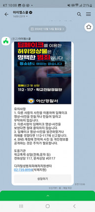 Ãæ³²Áö¿ª ¡®¾ÆÀÌ¿¥½ºÄ𡯠Çкθð ȸ¿ø 7,800¿©¸í¿¡°Ô µöÆäÀÌÅ© ¹üÁË¿¡ ´ëÇÑ À¯ÀÇ»çÇ×, ÇÇÇØ ¹ß»ý ½Ã µµ¿òÀ» ¹ÞÀ» ¼ö ÀÖ´Â ±â°ü µîÀ» È«º¸Çϴ īī¿ÀÅå ¸Þ½ÃÁö¸¦ ¹ß¼Û, À̹ÌÁö¸¦ Ŭ¸¯Çϸé Áï½Ã °æÂûû ¾ÈÀü Dream »çÀÌÆ® ³» Çб³Æø·Â ½Å°í¡¤»ó´ã ÆäÀÌÁö·Î ¿¬°áÇÒ ¼ö ÀÖµµ·Ï Çß´Ù.