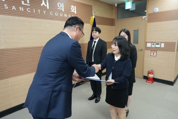 È«¼ºÇ¥ ÀÇÀåÀº ¡°¿ì¸® ¾Æ»ê½ÃÀÇȸ¿¡¼ °øÁ÷»ýȰÀ» ½ÃÀÛÇÏ°Ô µÈ ½Å±Ô ÀÓ¿ëÀÚµéÀ» ȯ¿µÇÑ´Ù¡±¸é¼ ¡°½ÃÀÇȸÀÇ ÀÏ¿øÀ¸·Î¼ ÀÚ±à½É°ú »ç¸í°¨À» °¡Áö°í ÀÇȸ ¾÷¹«¿¡ Àß ÀûÀÀÇÏ¿© ÀÇȸÀÇ ¹ßÀüÀ» À§ÇØ ¿ª·®À» ¹ßÈÖÇØ ´Þ¶ó¡±¶ó°í ´çºÎÇß´Ù.