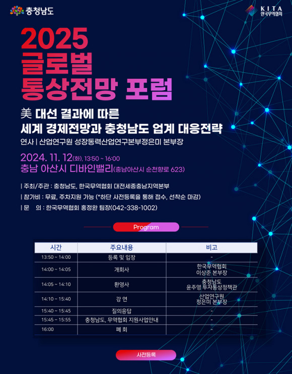 Ãæ³²µµ´Â ¹Ì±¹ ´ëÅë·É ¼±°Å¿¡ ´ëÀÀÇØ ¿À´Â 12ÀÏ ¾Æ»ê µð¹ÙÀι븮¿¡¼ ¡®2025 ±Û·Î¹ú Åë»ó Àü¸Á Æ÷·³¡¯À» °³ÃÖÇÑ´Ù°í 10ÀÏ ¹àÇû´Ù.