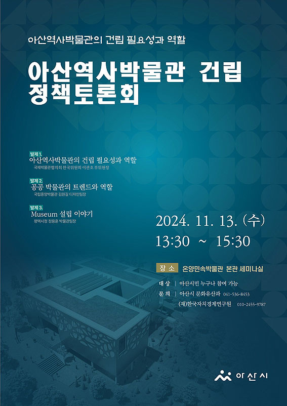 ¾Æ»ê½Ã°¡ ¡®¾Æ»ê¿ª»ç¹Ú¹°°ü °Ç¸³ Á¤Ã¥Åä·Ðȸ¡¯¸¦ ¿À´Â 11¿ù 13ÀÏ ¿ÀÈÄ 1½Ã 30ºÐºÎÅÍ 3½Ã 30ºÐ±îÁö ¿Â¾ç¹Î¼Ó¹Ú¹°°ü¿¡¼ °³ÃÖÇÑ´Ù.
