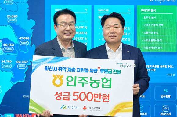 ÀÎÁÖ³óÇù(Á¶ÇÕÀå ±èÁø±Ç) ÀÓÁ÷¿øµéÀÌ 9ÀÏ Áö¿ª Ãë¾à°èÃþÀ» Áö¿øÇϱâ À§ÇØ ¼º±Ý 500¸¸ ¿øÀ» ¾Æ»ê½Ã¿¡ ±âºÎÇß´Ù
